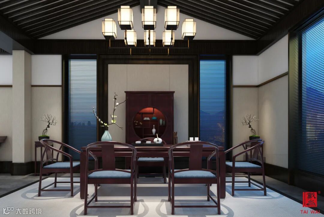 红木书房可以搭配挂画、书法、绿植等营造书香雅致的效果,而茶室可以放置花器、香具等物品作为装饰同时也能使用,让茶空间更具意境美。