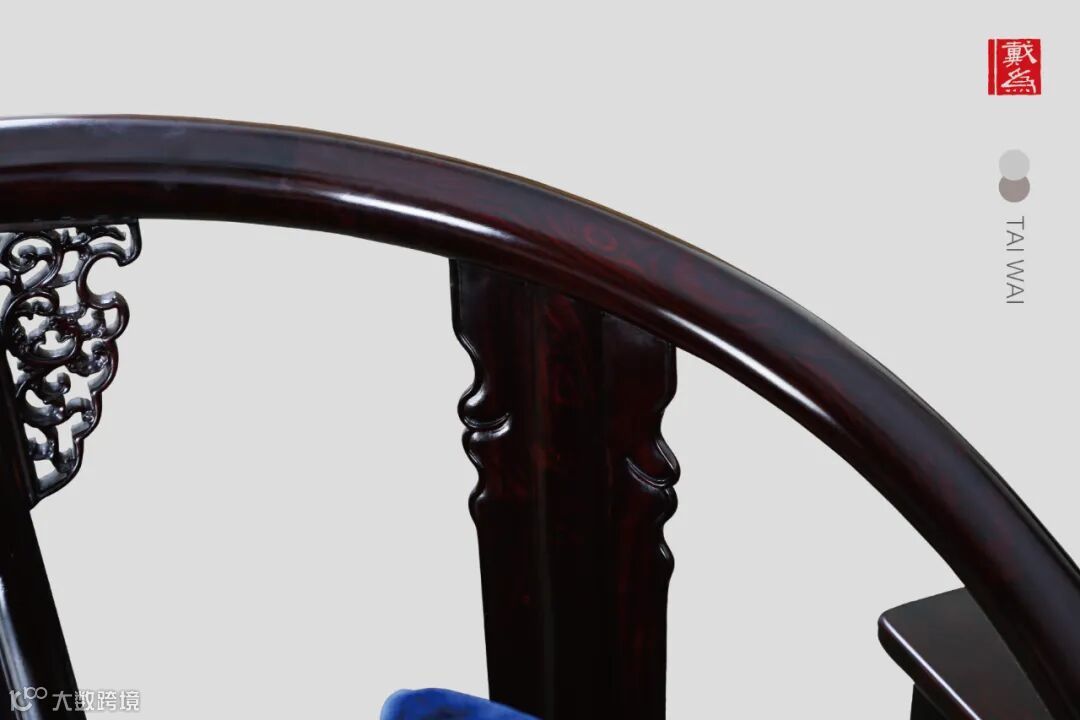 我们看到月牙扶手用楔钉榫连接,婉转变化的椅圈扶手处用一抹镂空卷草纹作为装饰,这更显整体的清澈通透。