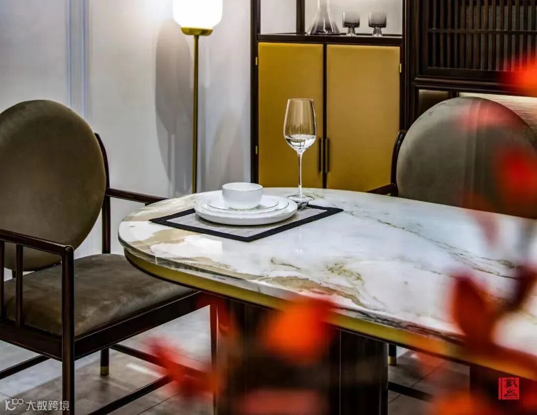 黄铜、大理石于中式轻奢来说,不仅起到点缀修饰的作用,功能性也很强。黄铜用作家具的封边,拉手部件等,大理石则被当做案台餐桌的台面。
