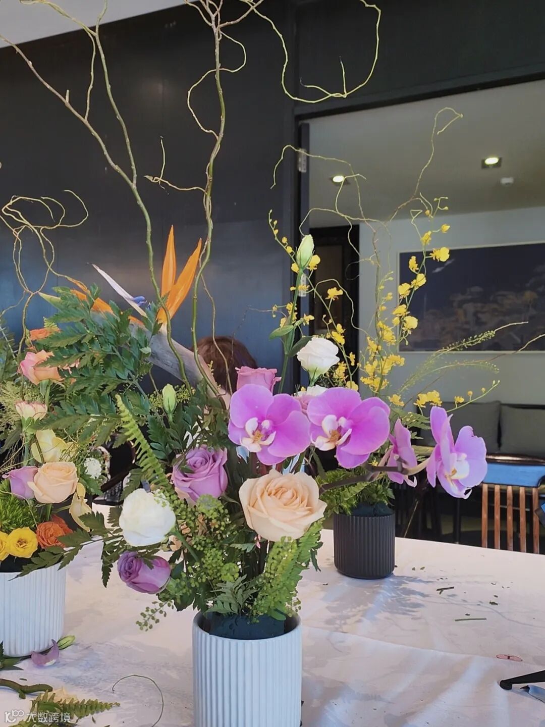 花材、花器、工具等,我们老早就备好了。大家要做的是剪枝、修叶,在花瓶中来来回回地调整造型,把一朵朵花装进花器中。