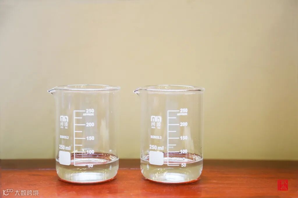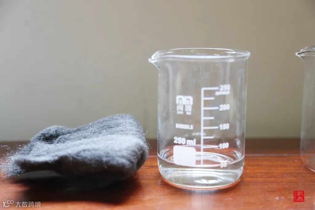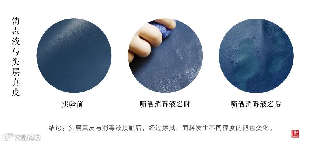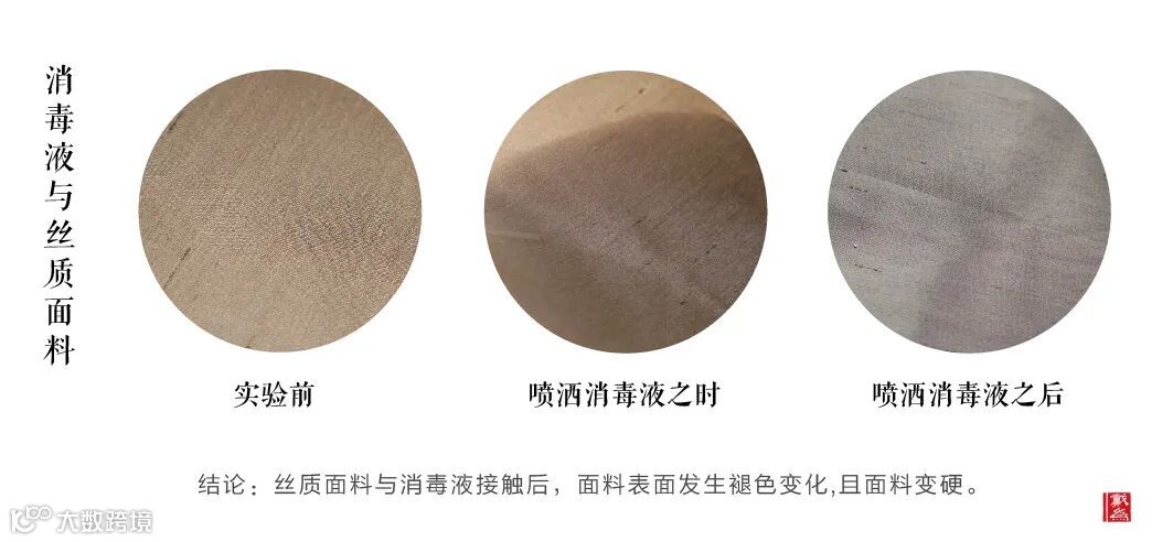 ①消毒液与丝质面料、头层真皮接触,观察面料是否会产生变化?