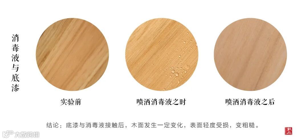 实验描述:我们通过在上了透明底漆的木板面上喷洒消毒液,观察其变化反应,底漆木板与消毒液接触后,木面会呈现明显的透明印记,漆面遭到一定程度破坏。