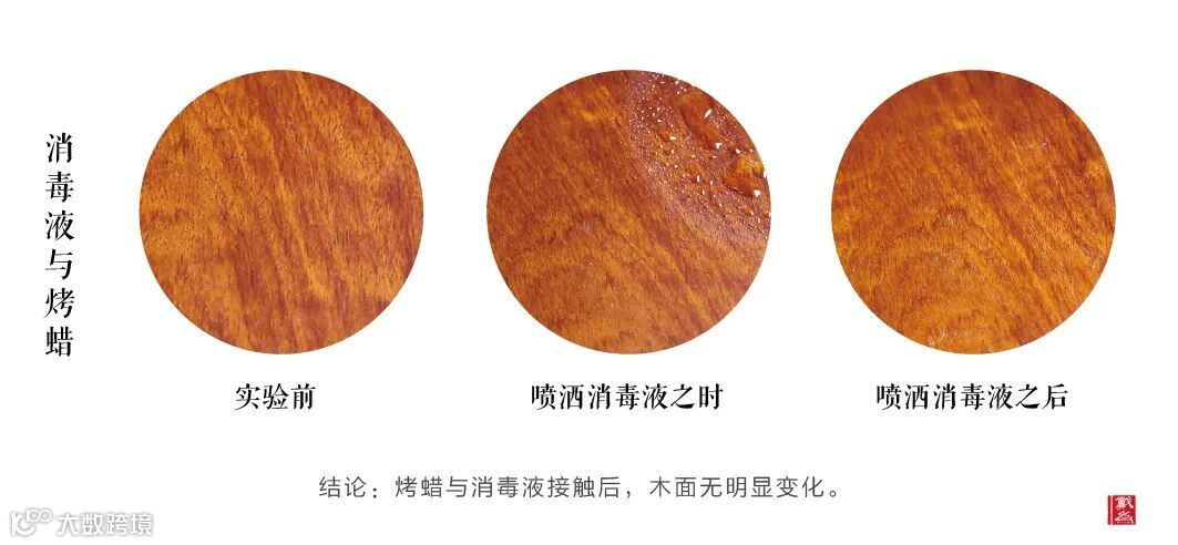 红木家具中,大家常提到“南漆北蜡”,说的是两种不同的涂装工艺,两者各有千秋。前面已提及大漆,下面一起来看看擦蜡涂层和烤蜡涂层,它们在消毒液的作用下会发生的变化。