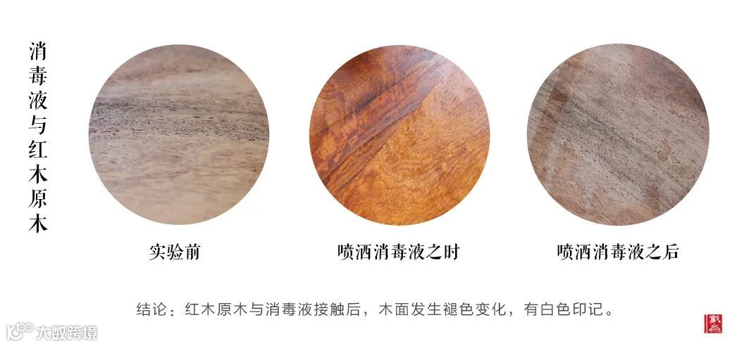 实验描述:我们可以看到,红木原木材质在与消毒液接触后,木面呈现不同程度的褪色变化,晾干后,表面逐渐泛出白色渍迹。