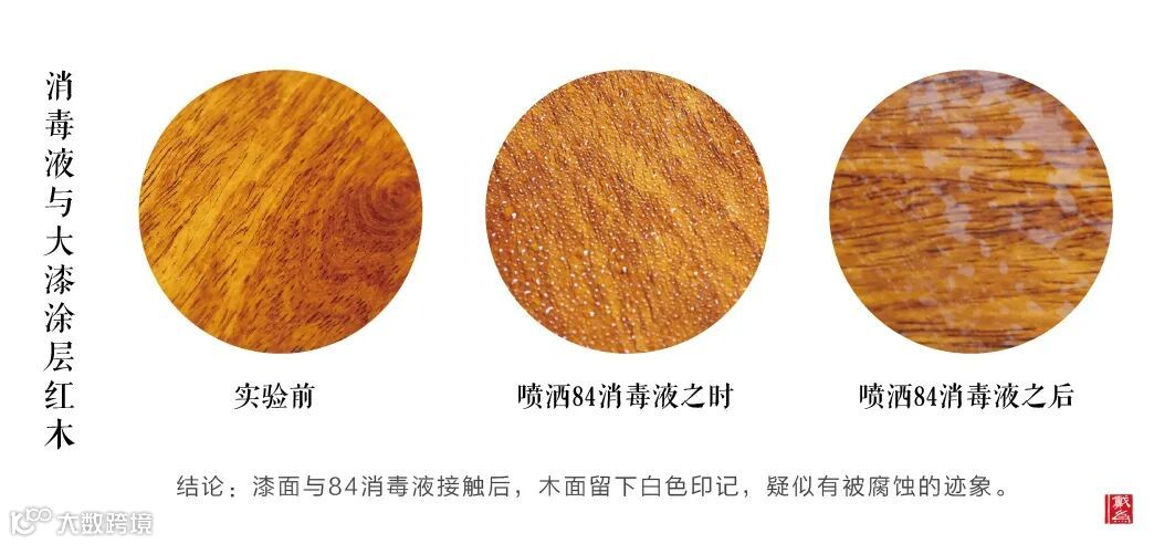 ④84消毒液、酒精与大漆涂装红木接触,观察漆面是否会产生变化?