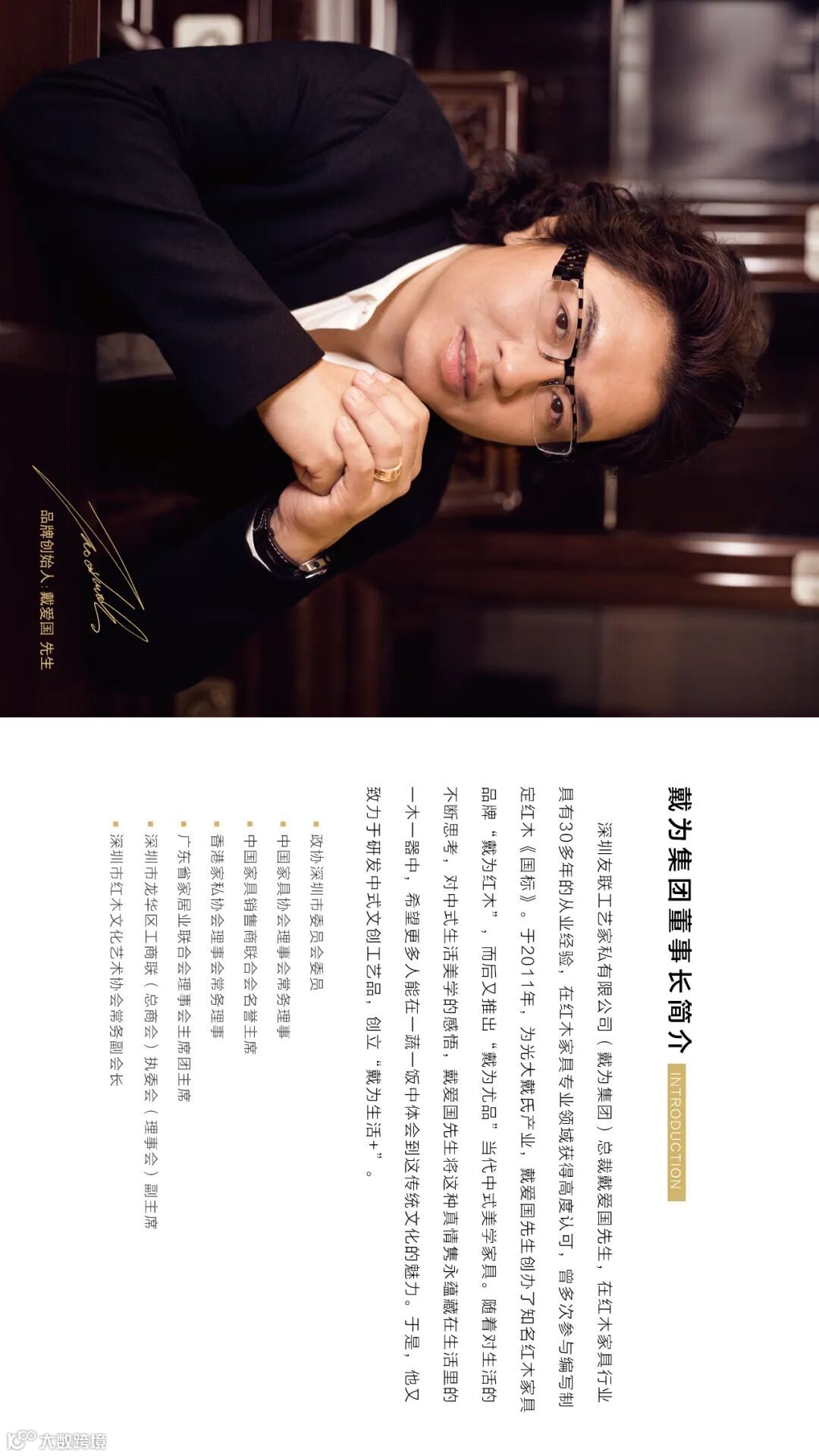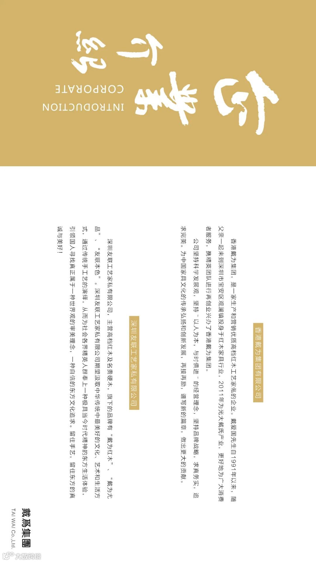 深圳友联工艺家私有限公司,主营高档红木及名贵硬木,旗下的品牌有“戴为红木”、“戴为尤品”、“友联本色”。深圳友联工艺家私有限公司期望汲取中华传统中最美好的文化、艺术和生活方式,通过传统手工艺的演绎,从而为社会各界精英人群奉上一种极具当今时代精神的东方生活体验,引领国人寻找真正属于一种世界观的审美理念,一种自信的东方文化追求。留住手艺,留住东方的真诚与美好!