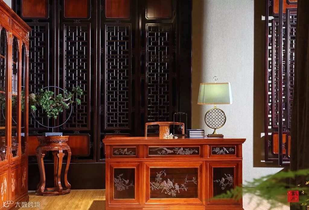 书房就是心灵的栖息之地,而端庄大气的红木写字台,给人带来一抹书香、一丝动力,一种学习之时的仪式感,让人摒弃了世俗的喧嚣与繁杂。