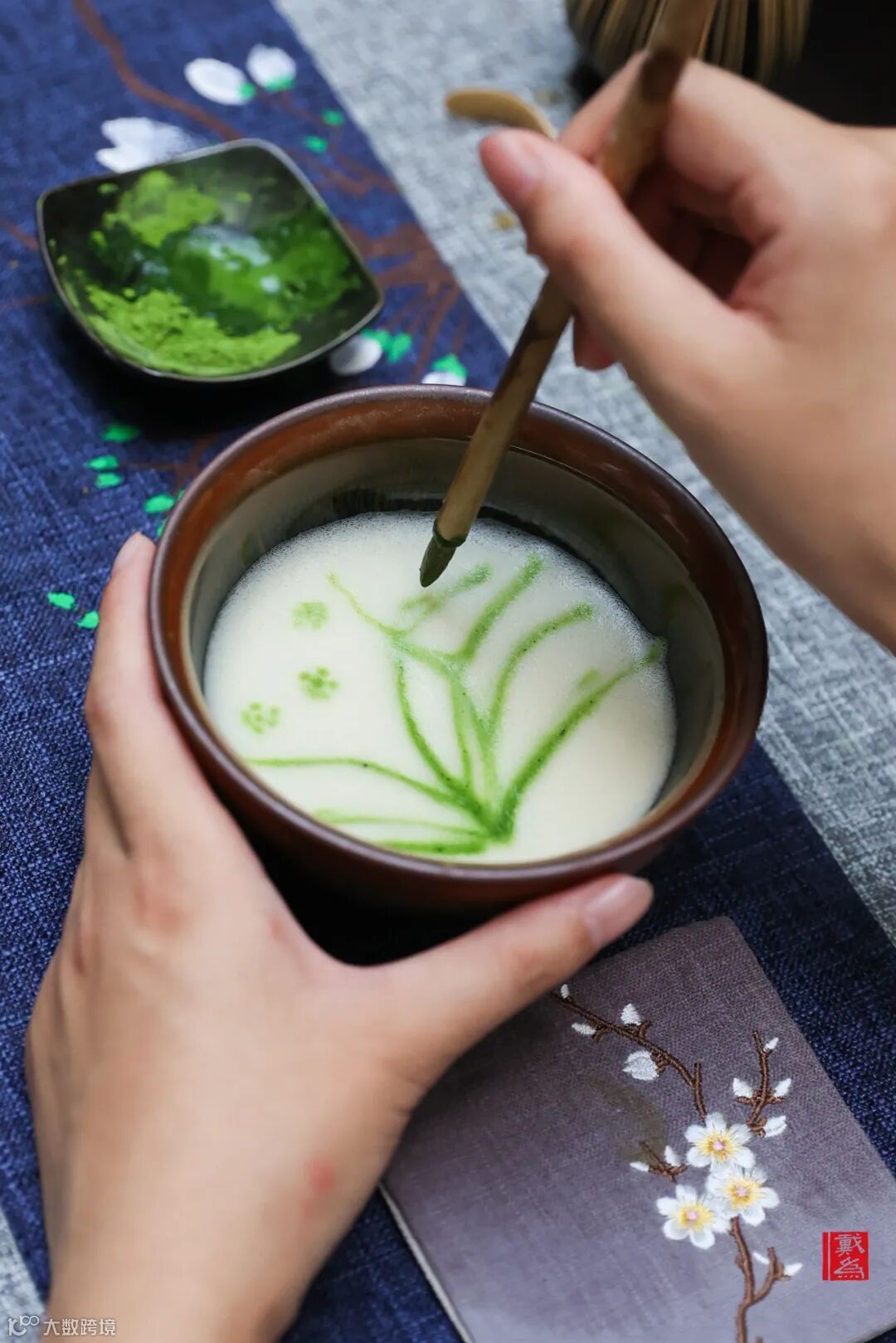 一撮茶粉,分次注入水,轻击泛起白沫,茶乳融合。在茶汤上写字作画,一点青竹,点点星华;又与人斗茶,众人围观,颇有雅趣。