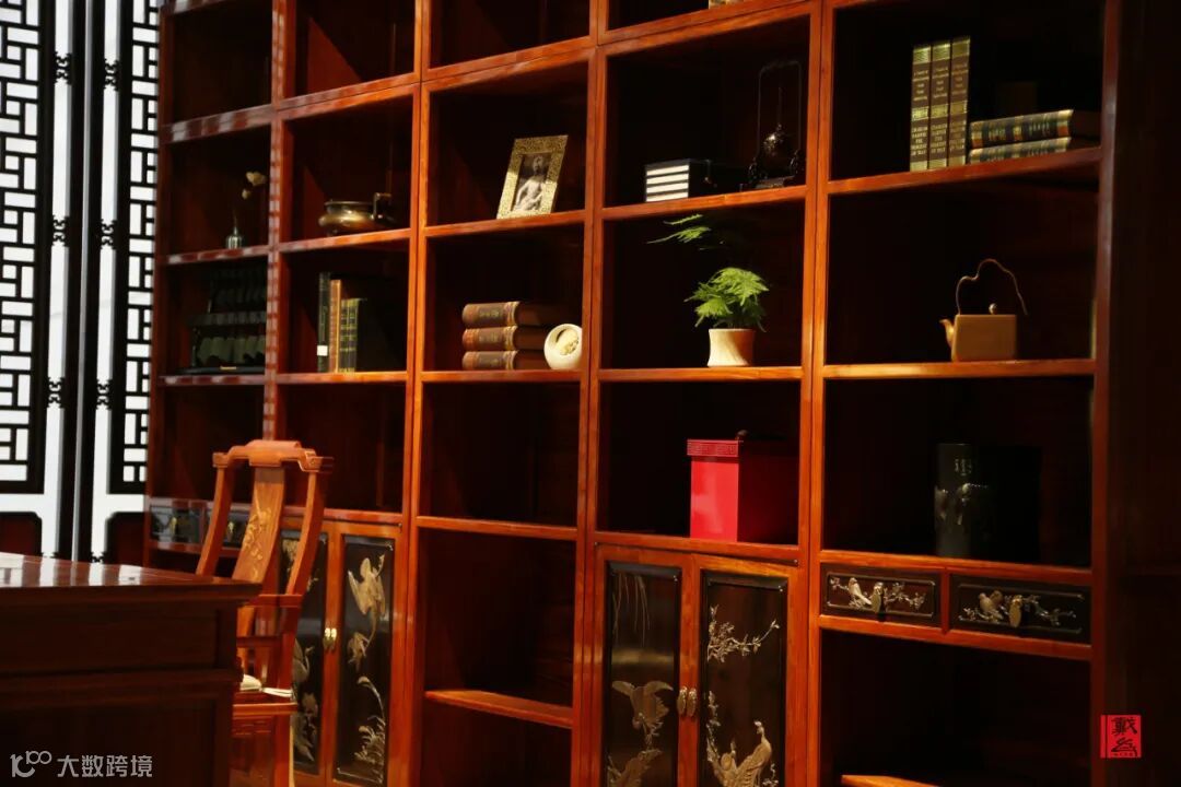 被当做屏风做隔断空间之用以及做书架、书柜的情形更多了起来。高低不同、错落有致的镂格容纳不同规格藏物的同时,也更显雅致精美,打破传统的陈设美学。错落的格子视觉上分割开了空间,文物书籍整体布局也为空间增加了雅致氛围。