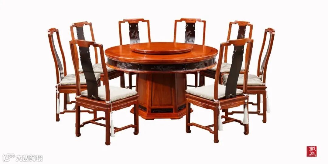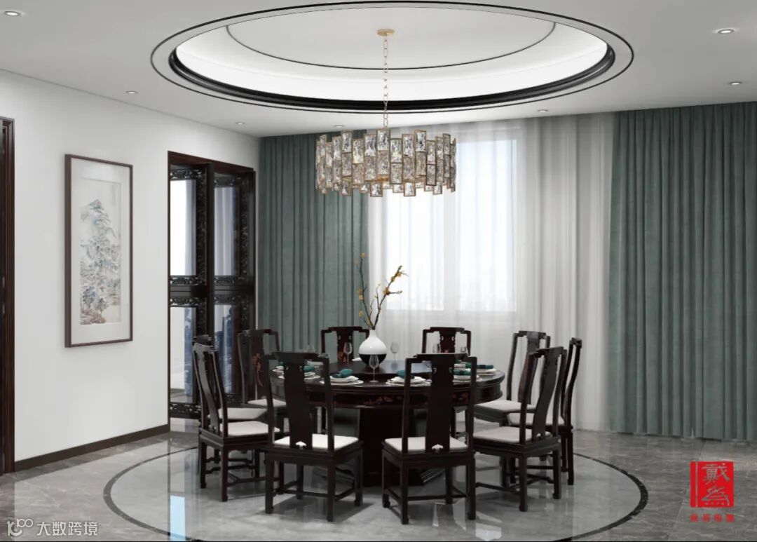 空间采光非常好,装上浅绿的窗帘,让餐厅流露温和的气质。其次是檀韵圆台的古典气质,圆台周围用丝翎檀雕工艺刻画灵动的鸟雀,苍劲的植物,用手工艺打造出文人气息浓郁的家具。