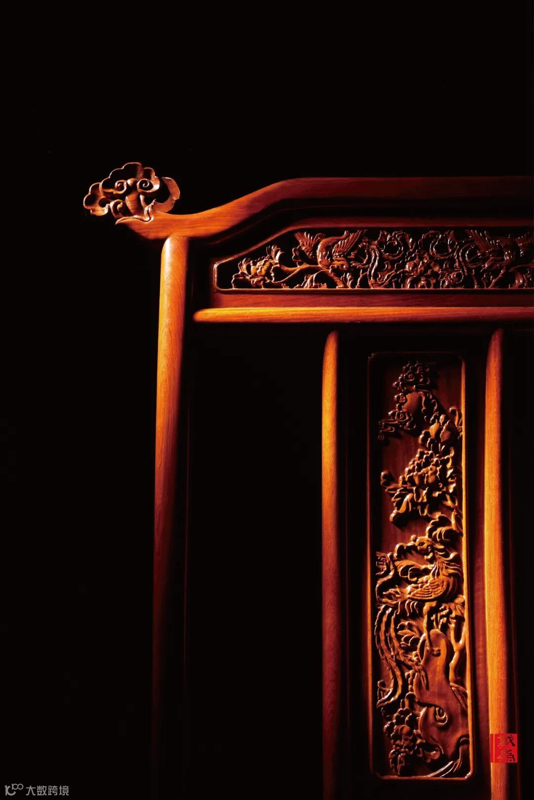 在红木家具实际运用中,云纹还与其他神兽、福字配合。云纹为天,神兽处其中空间。或者用于作为固定或者连接用的装饰件上,也不会显得突兀。云纹包括卷云纹、朵云纹、如意云纹、灵芝云纹、团云纹、叠云纹等,在红木家具中,主要应用于背板、腿足、牙子、挡板、壶门等部位。或秀气灵动,或厚重华贵,或层层叠叠作仙境之感。
