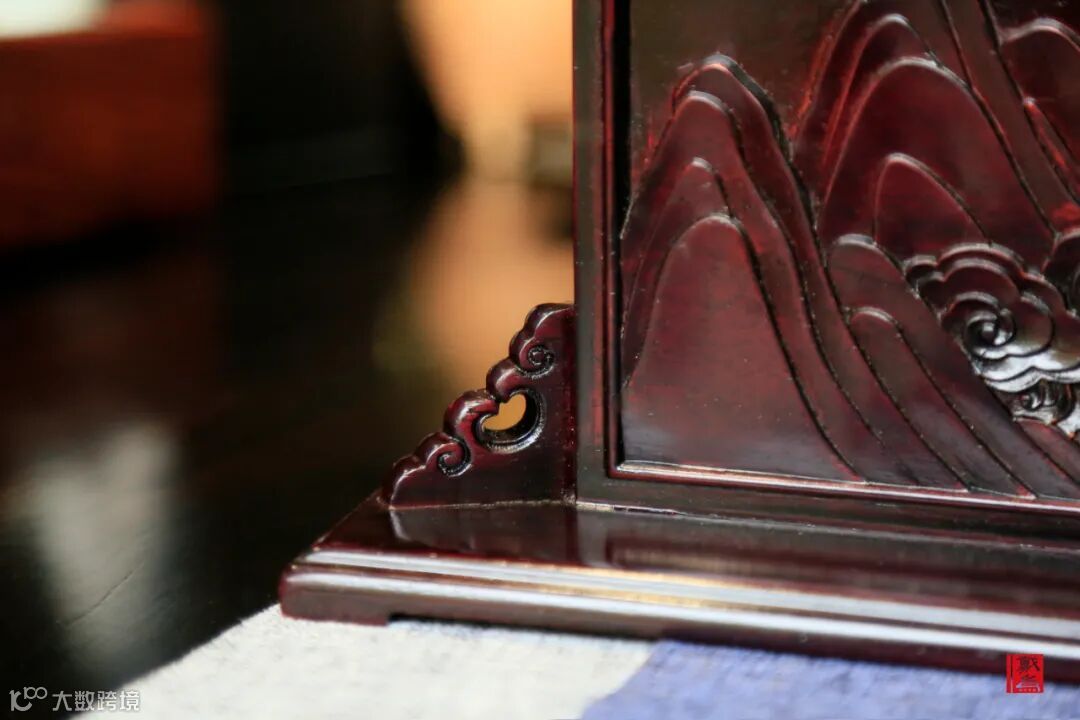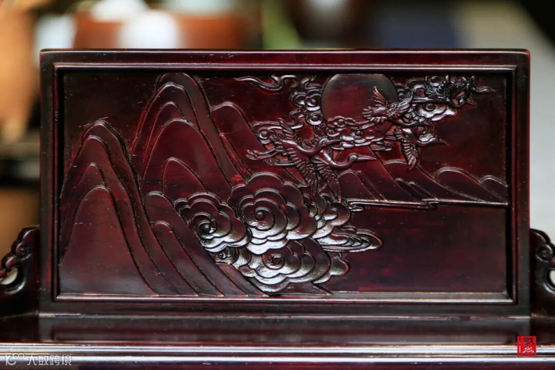 小台屏的表面刻画有山峰、云纹、鹤鸟、日出等立体雕刻图案,让人见之不忘。这不由得让人想起“红日初升,其道大光”一诗,想到晨曦、破晓等画面,充满希望。