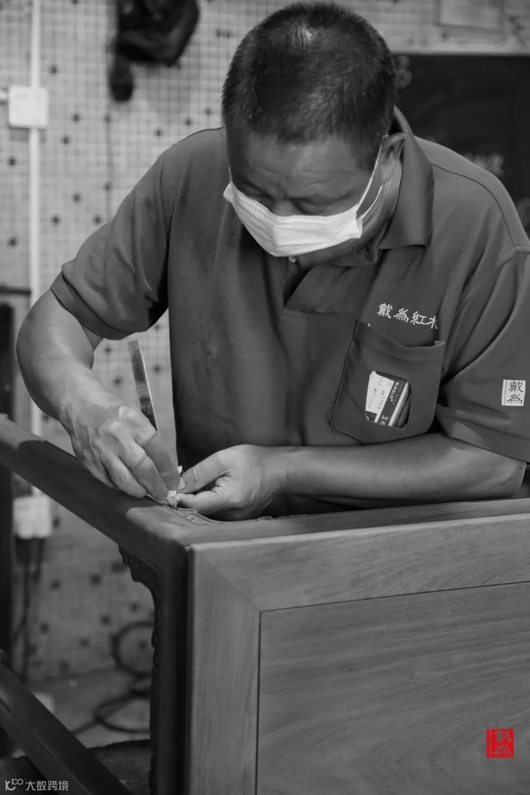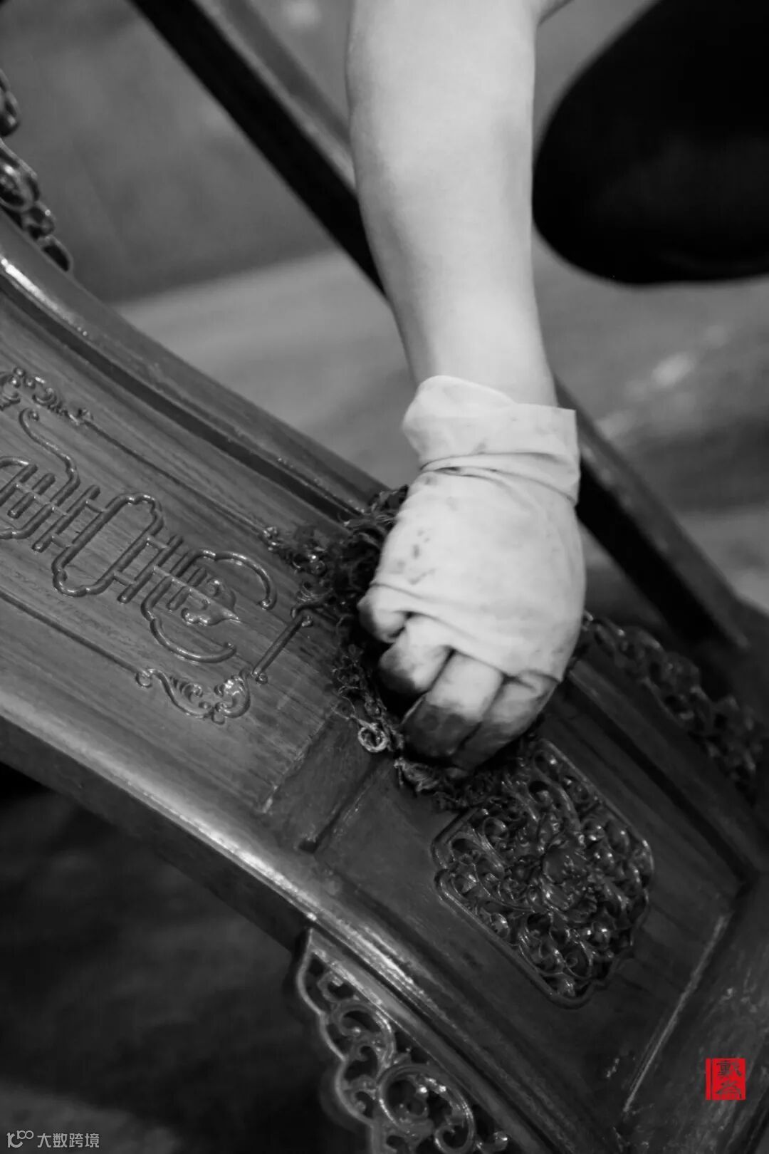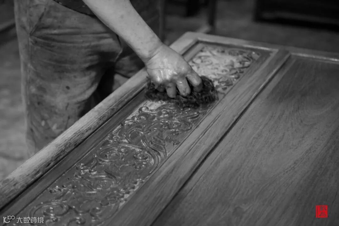 一种白色粘性乳液,需经过师傅数次擦拭,才让家具妥帖地“穿上这件衣裳”。“这件衣裳”给予家具保护,让器物不易被损坏,同时,也让红木家具焕发温暖与韵味。
