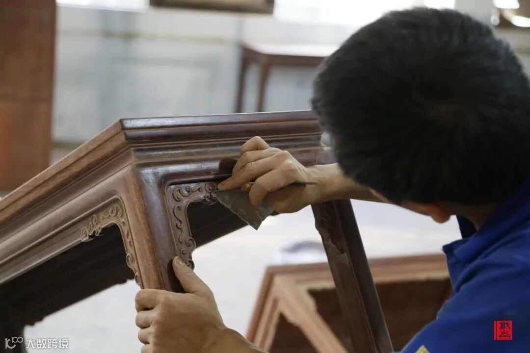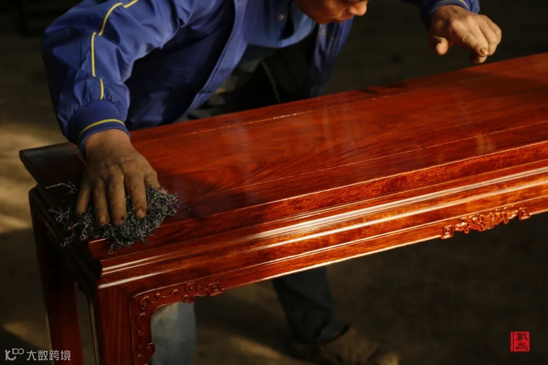 打磨是繁琐的工序,那涂装上漆更是反复的过程。擦拭、晾干、再擦拭、再次晾干……想要将红木木性凸显得淋漓尽致,不经过多次的生漆擦拭,哪能看到木面的华美。