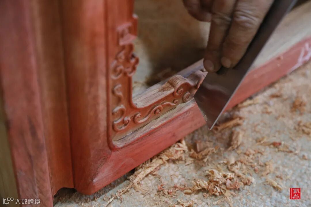且这种打磨不是我们想象中的用砂纸在平面磨砂,而同时会借助铁片、刀片这些坚硬且精细的器具,对条案的细节同样做出处理,不甘落后。