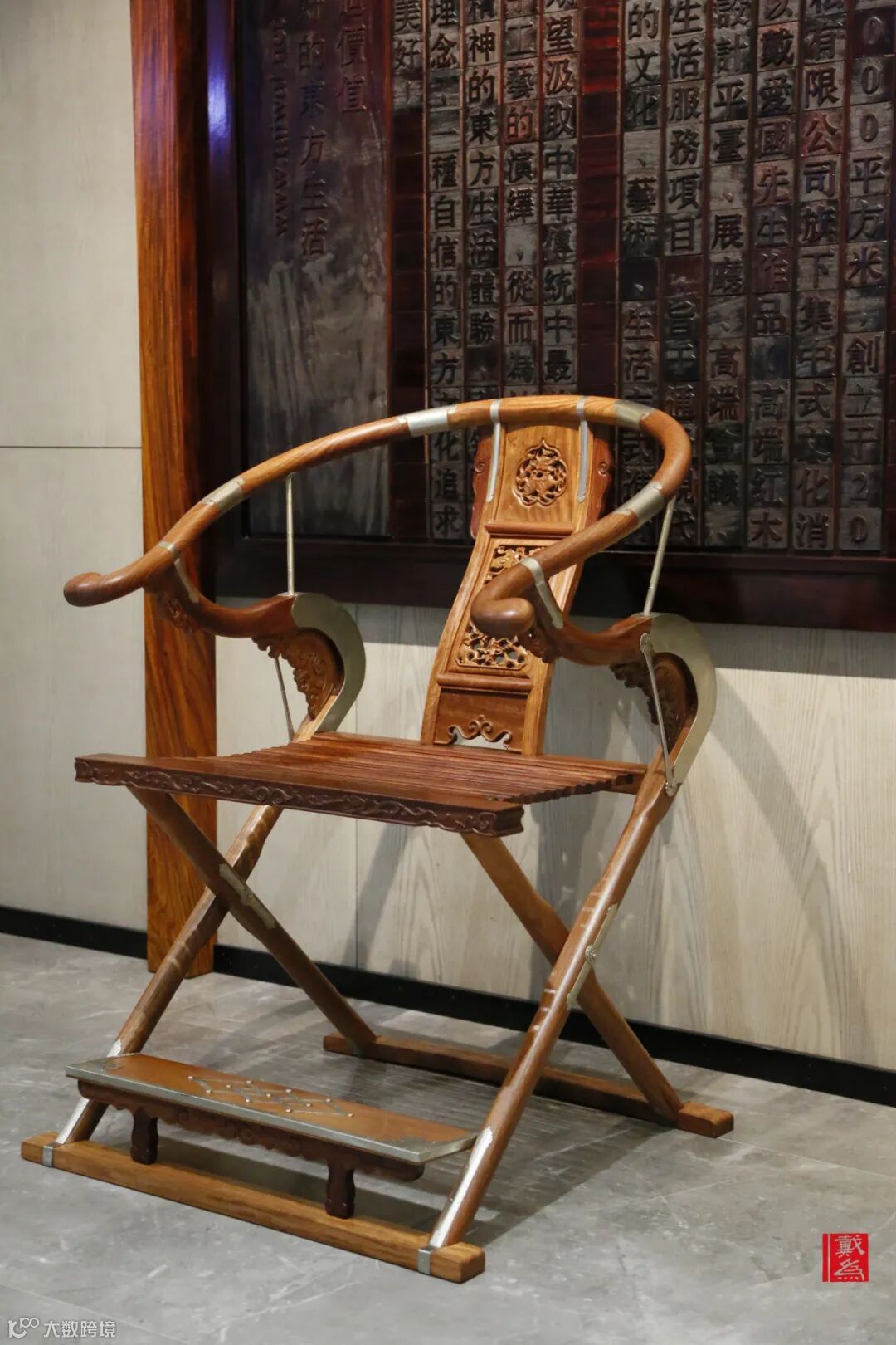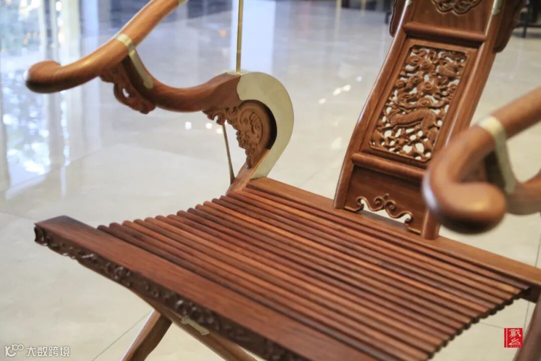 为了满足折叠的需求,椅圈与底座的连接方式不同以往,不再是联帮棍与鹅脖,而是用腿足的力量来支撑扶手,再在转角之处稍作吉祥图案装饰。