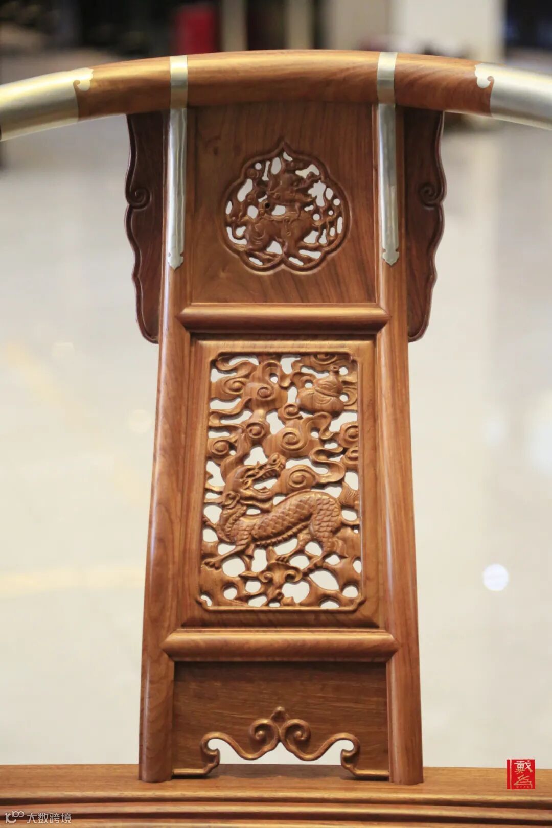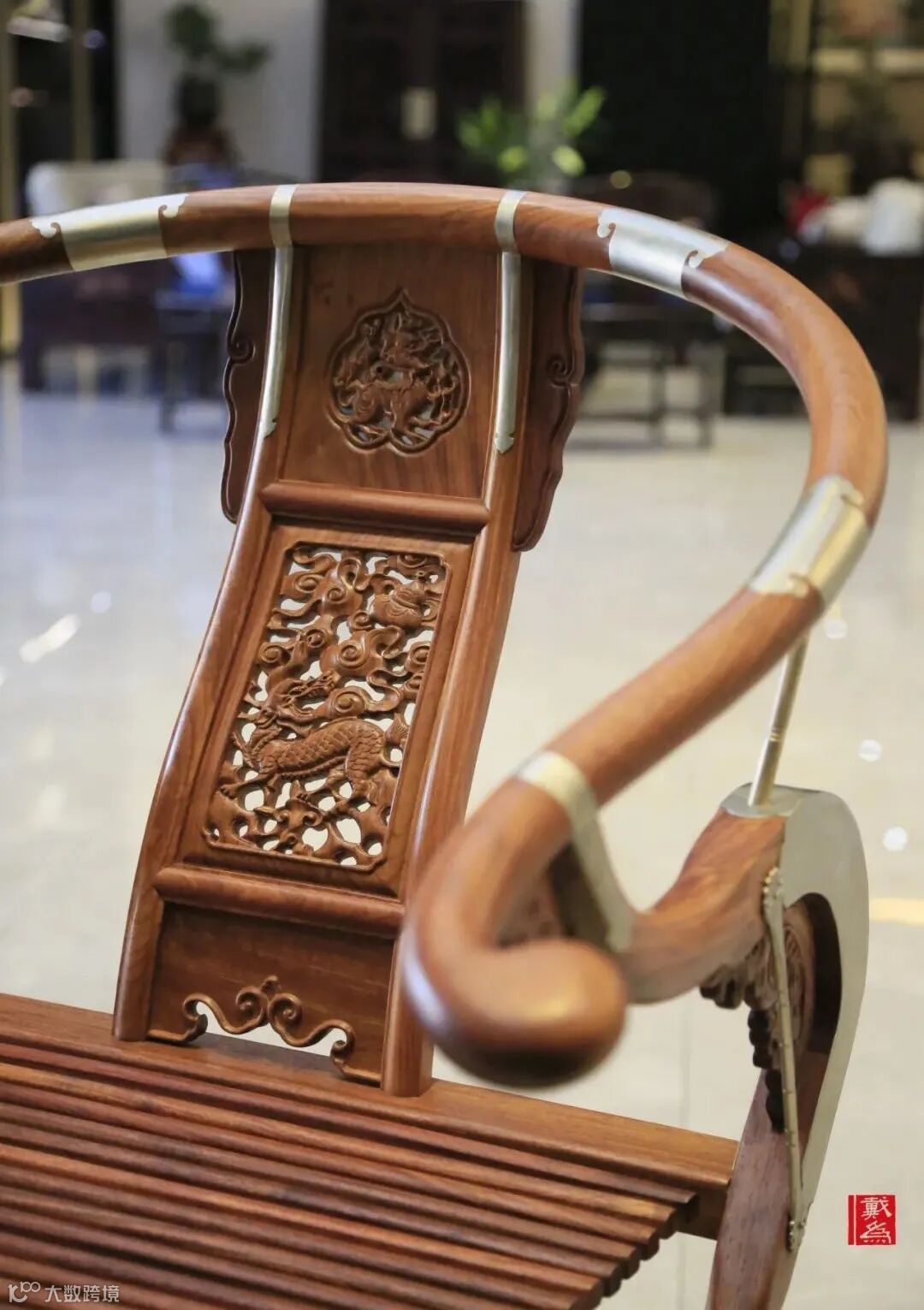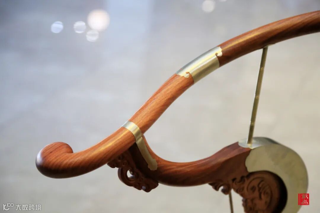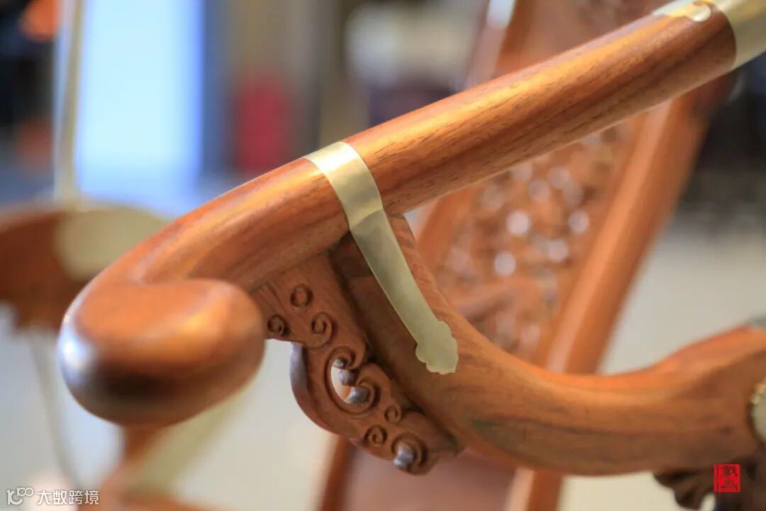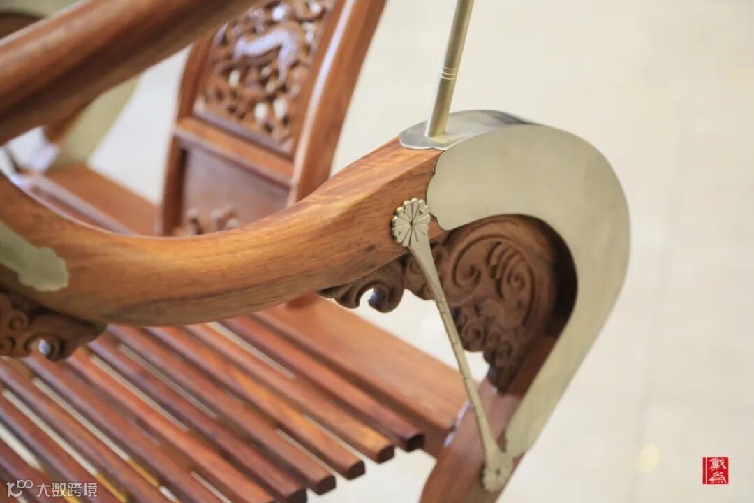 前面说到其与圈椅有所相似,但不同之处在于此处巧用金属元素装饰,于榫卯连接处采用金属叶片包裹嵌入,这不仅是材质的结合与点缀,也起到加固的作用,让整体结构稳固、安全。