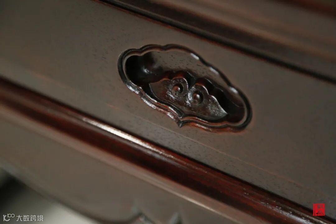 常见椅几少有小抽屉设计,而这里,将茶几的使用功能进行深化,多了收纳功能。更为别致之处在于,用立体深凹的如意纹作为拉手,好用且精美。