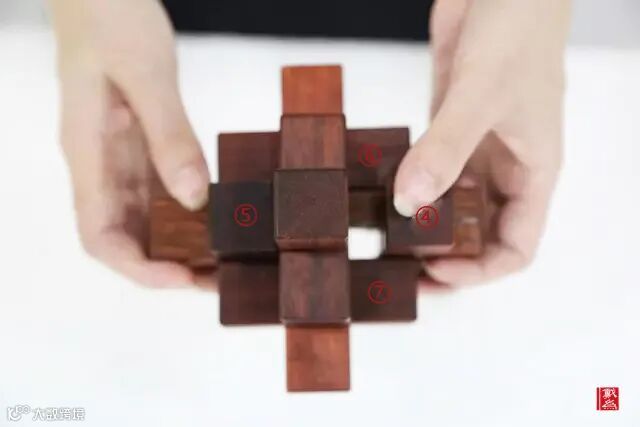 最后,我们旋转④号木条,让它紧密地卡在整体结构上。至此,鲁班锁的装搭就完成了。