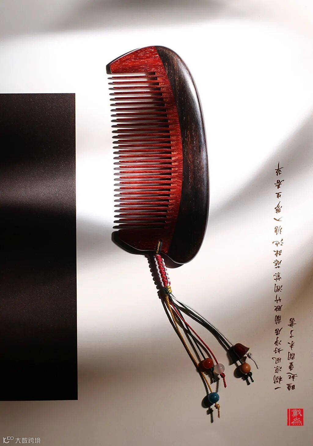 南红、紫檀钟型铃铛、老山檀弟子珠、玛瑙、灵灰石等精美装饰被一株绳子系在一起,缀成一缕流苏,给梳子注入了灵动的气韵。