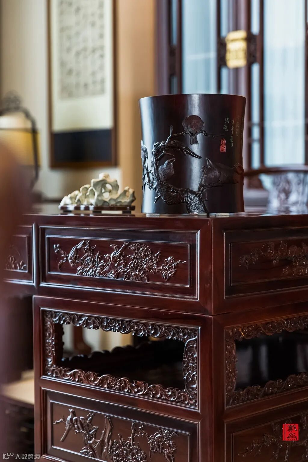 更为重要的是,有的红木办公家具体量较大,这彰显办公区域的大气之外,也突出使用者的身份和气场。