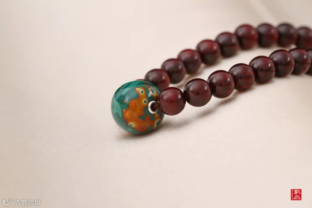 这串念珠素朴,不繁杂,一颗大漆彩珠的装饰透露着少即是多的设计理念。