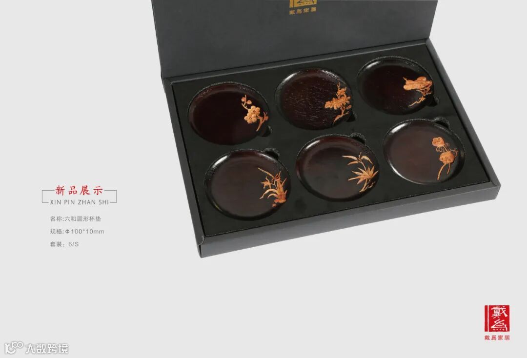 六只杯垫,精巧轻便,采用精湛的丝翎檀雕工艺,对梅、兰、竹、菊、松、莲等六种寓意美好的花卉进行勾勒、刻画。