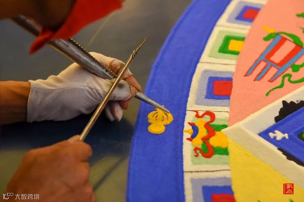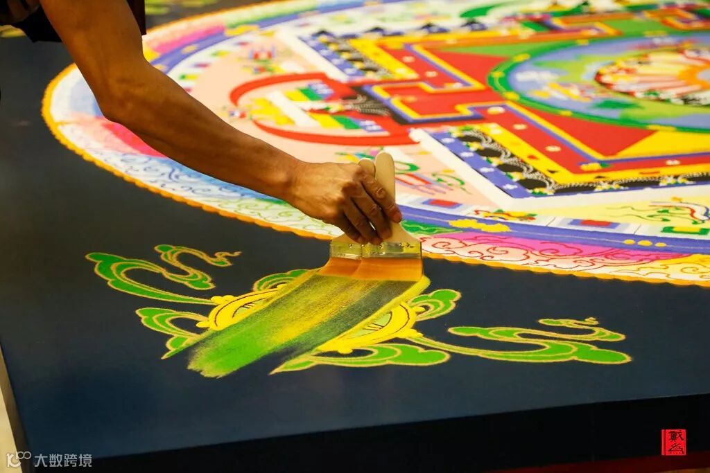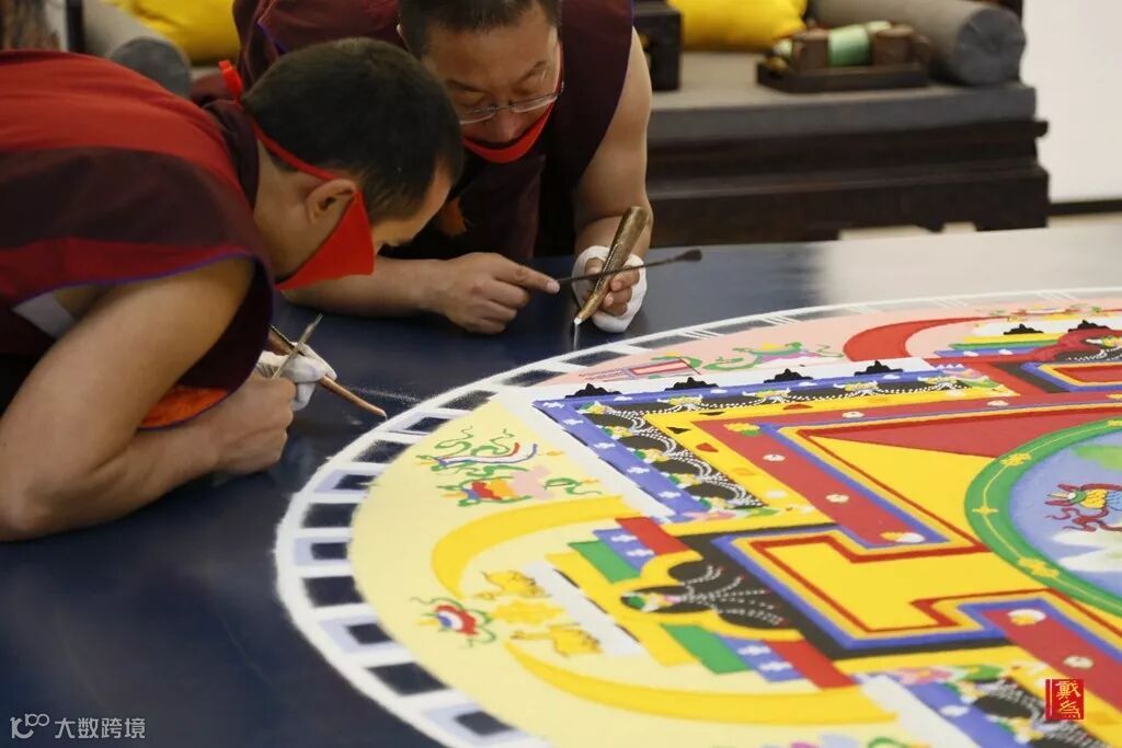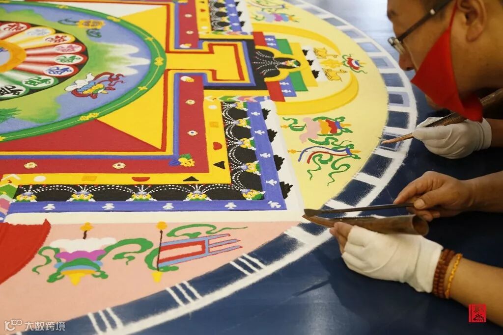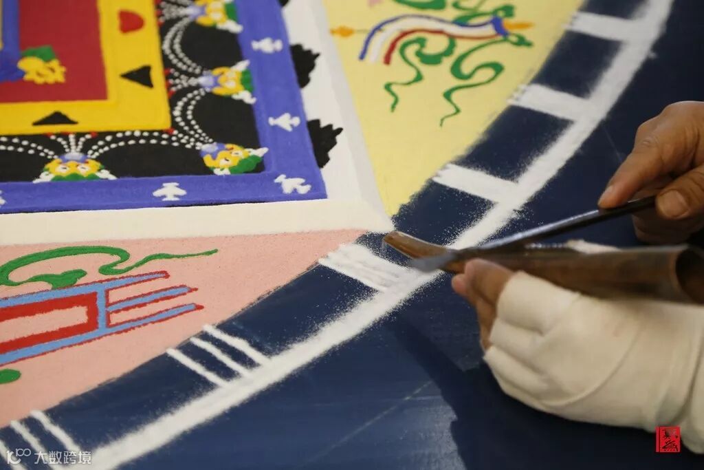 坛城画师沿着仪轨,从正中心逐渐向四周细细堆砌、勾勒,而且要全心投入,因为若稍有不慎,沙画就要前功尽弃。