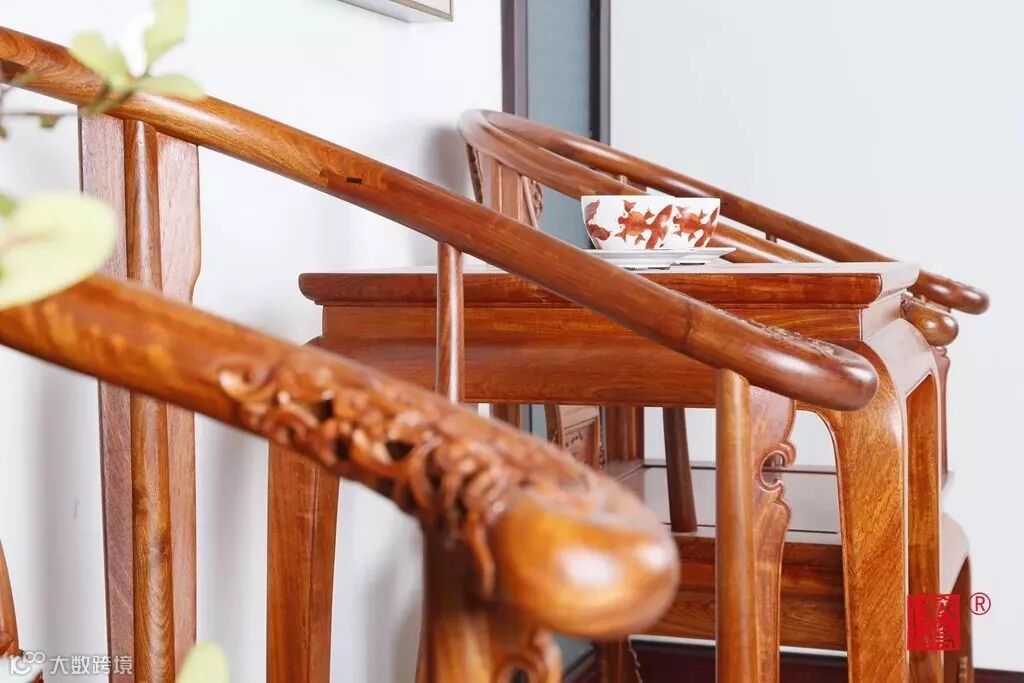 皇宫圈椅的靠背、扶手、腿足和茶几的腿足等部件的纯手工雕花图案,完美地点缀了家具,让它不仅端庄,也带有一丝秀丽。