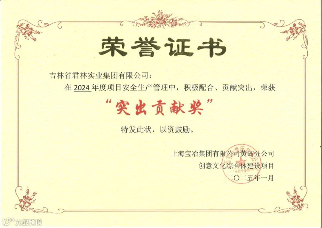 近日,吉林省君林实业集团有限公司凭借在 “创意文化综合体” 项目中的出色表现,获上海宝冶集团有限公司授予的突出贡献奖,充分彰显其在项目建设中的关键作用与强大实力。