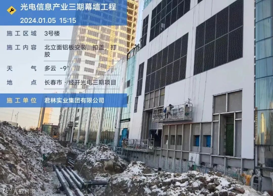 近日,由君林实业集团承接的光电信息产业三期幕墙工程在冬季进行施工。尽管面临严寒天气的挑战,但项目团队不畏艰苦,全力以赴确保工程的保质保量完成。