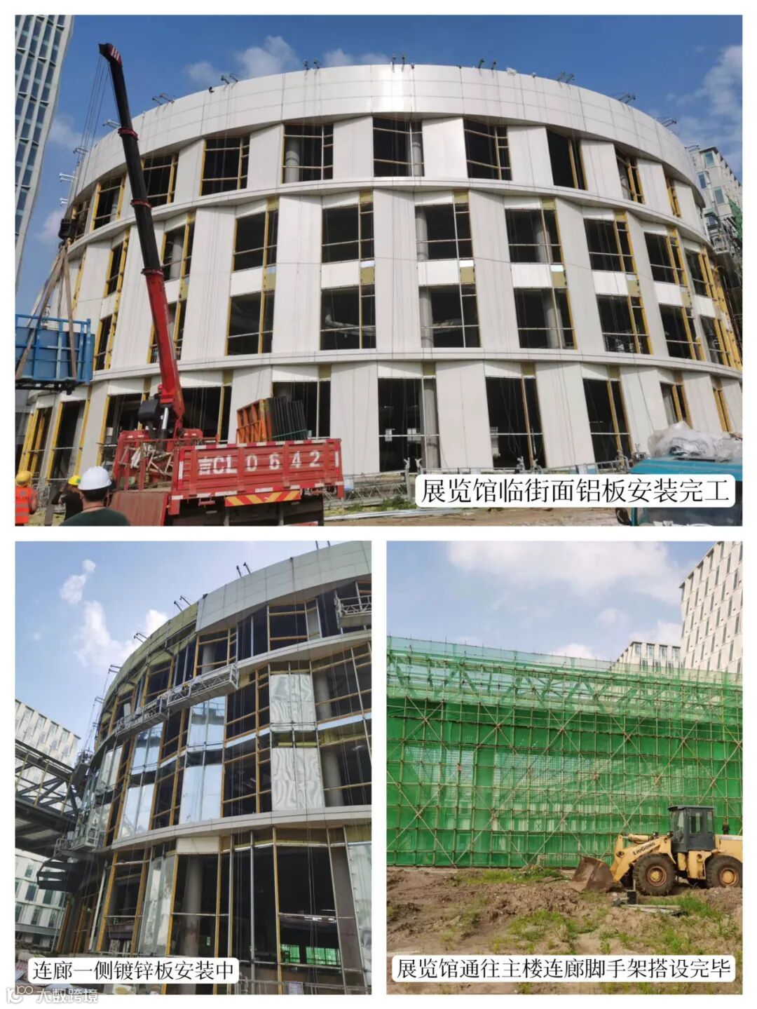 项目展览馆位于园区内部、超百米主楼南侧,总施工面积约8000平方米。君林实业集团于6月中旬进场至今,已完成龙骨安装等基础工作,至8月中旬,展览馆的临街面铝板安装已完成、连廊一侧正在进行镀锌板安装;同时,展览馆通往主楼连廊脚手架已搭设完毕,预计至8月底完成骨架焊接施工工作。(点击下图可详细了解项目概况)