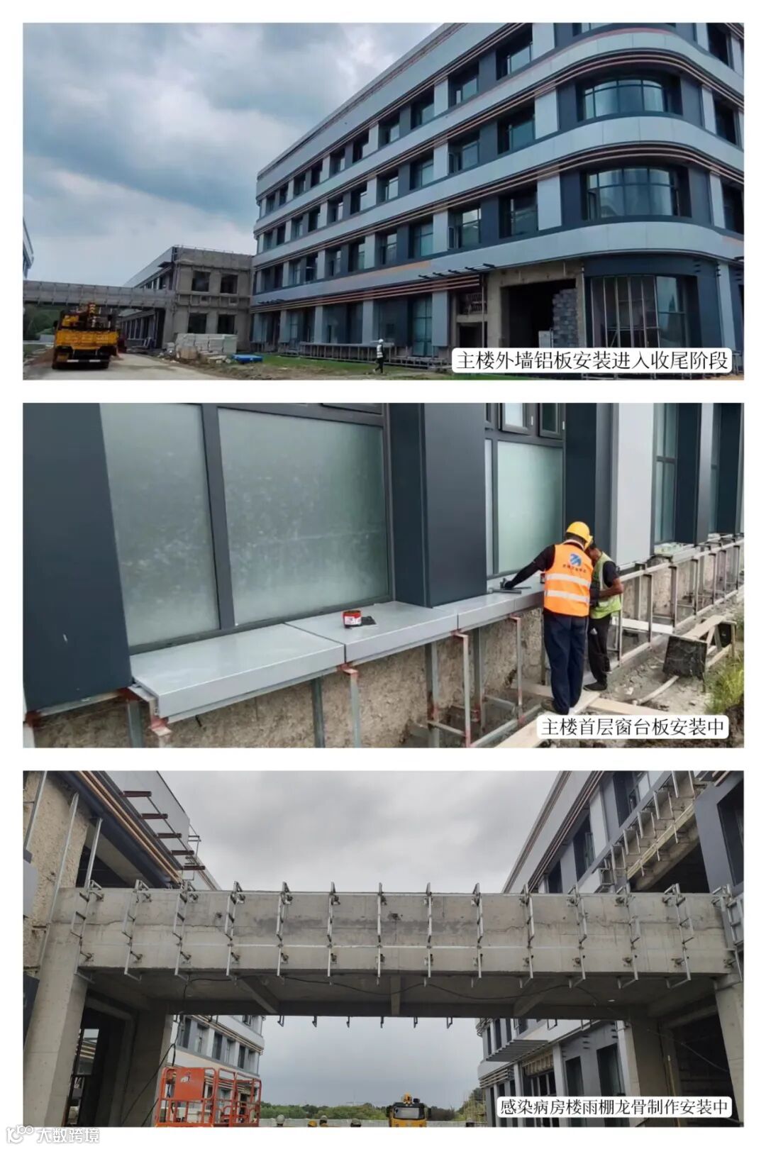 目前,项目行政主楼外墙铝板安装进入收尾阶段、首层窗台板安装进行中,预计9月底完工呈现;同时感染病房楼雨棚龙骨制作安装中。