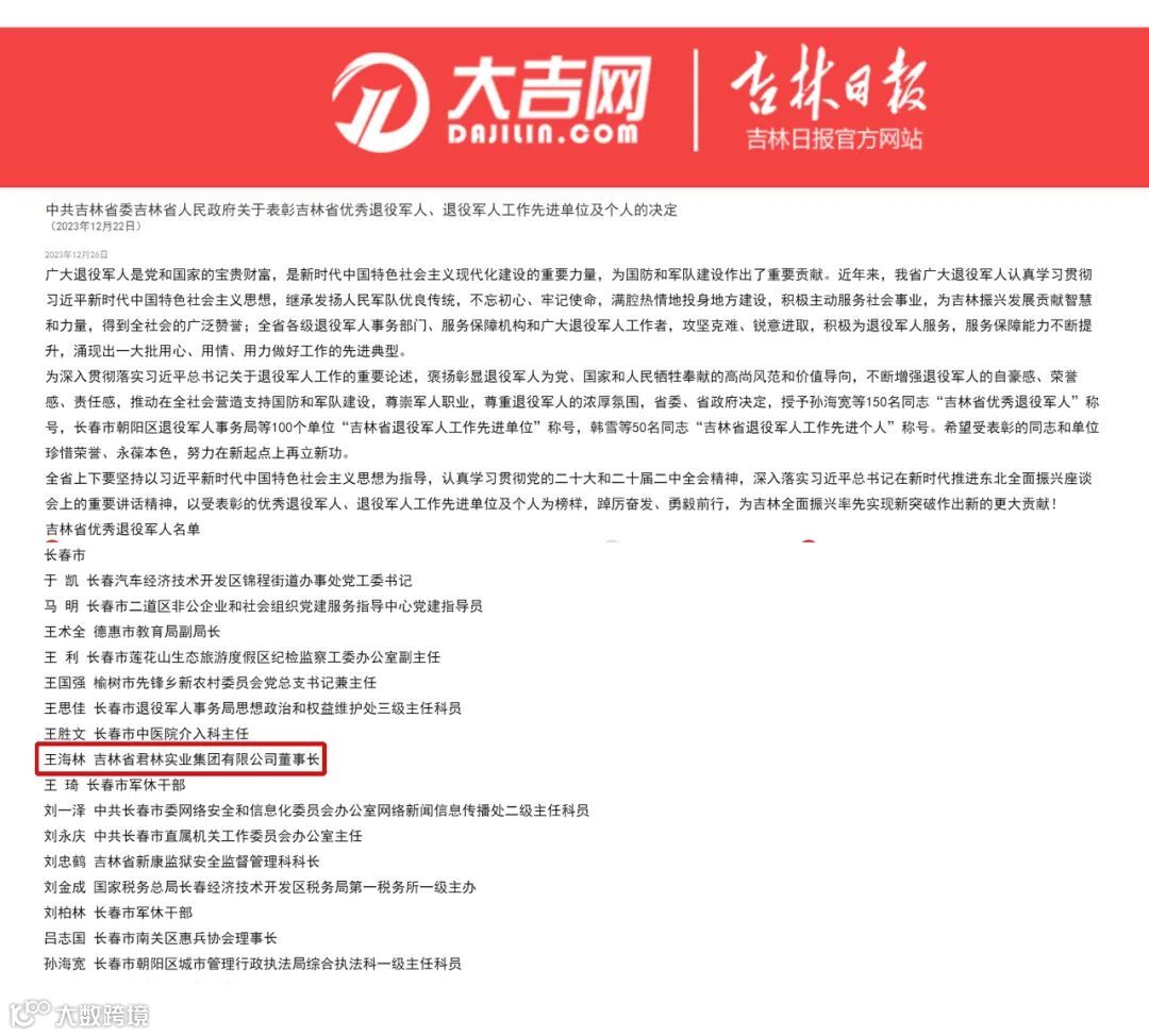 为树立先进典型,弘扬光荣传统,激励广大退役军人再接再厉、勇攀新高峰,中共中央省委吉林省人民政府决定,授予吉林省君林实业集团董事长王海林先生等150名同志“吉林省优秀退役军人”称号,希望受到表彰的同志珍惜荣誉、再接再厉,充分发挥模范带头作用,继续为国家和人民作出更大贡献。