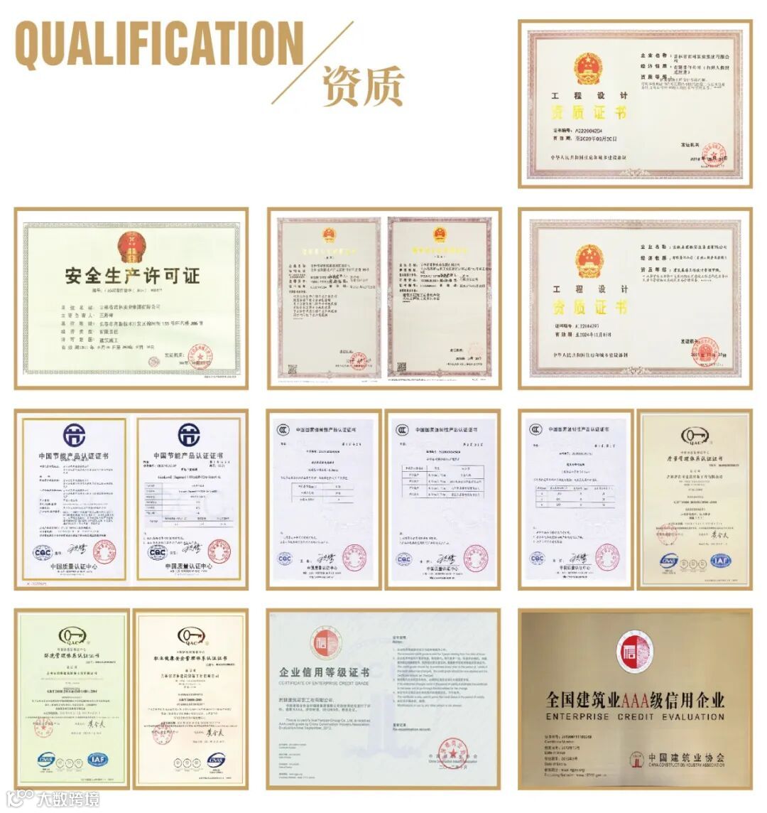 施工资质:建筑幕墙工程专业承包壹级、建筑装修装饰工程专业承包壹级、电子与智能化工程专业承包贰级、消防设施工程专业承包贰级、防水保温工程专业承包贰级、钢结构工程专业承包贰级、建筑工程施工总承包叁级、机电工程施工总承包叁级。设计资质:建筑幕墙工程设计甲级、建筑装饰工程设计乙级。