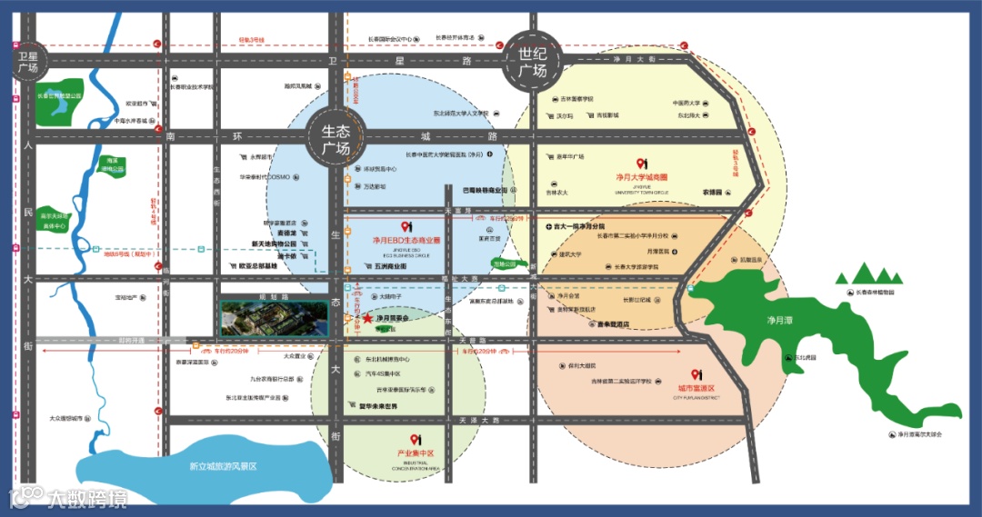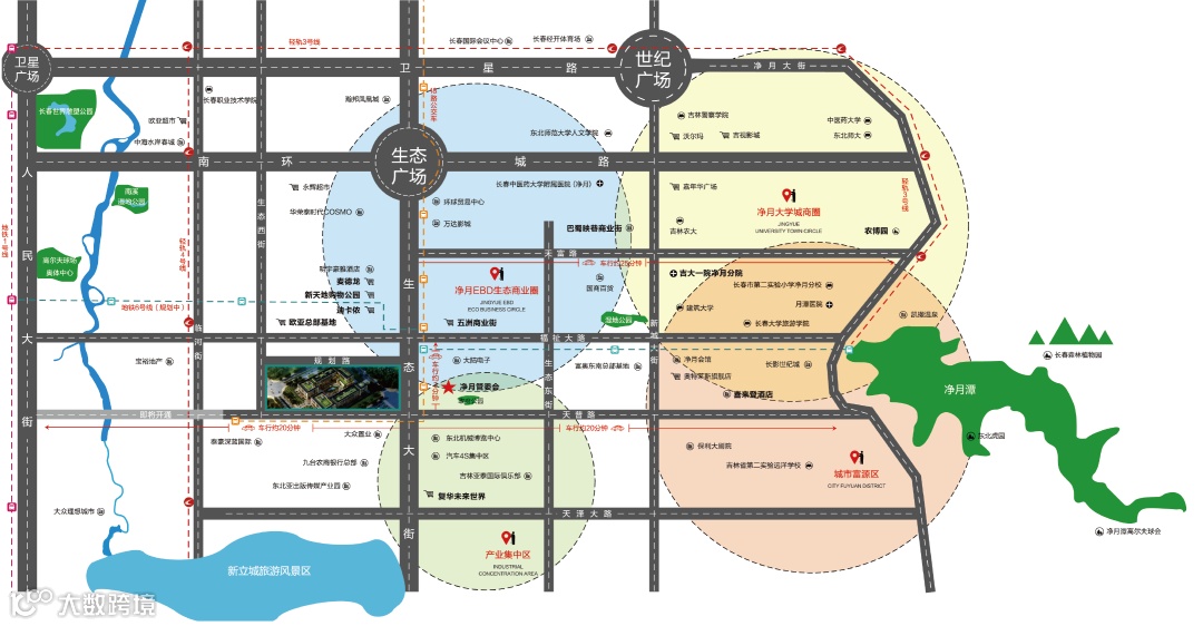 君临智谷产业园位居净月交通枢纽,2KM内轻轨3号线、4号线、地铁6号线(在建)均可到达,缩短通勤时间,带来高效商务体验。便捷的交通也带来了大量的人流和商机,保障君临智谷产业园的稳健经营发展。