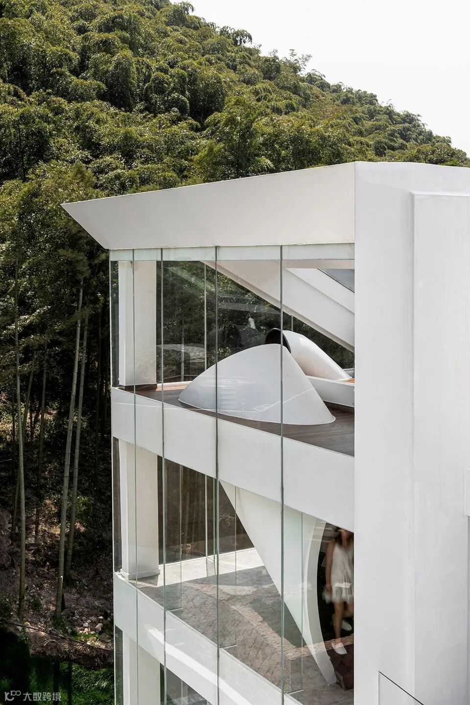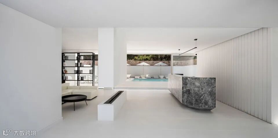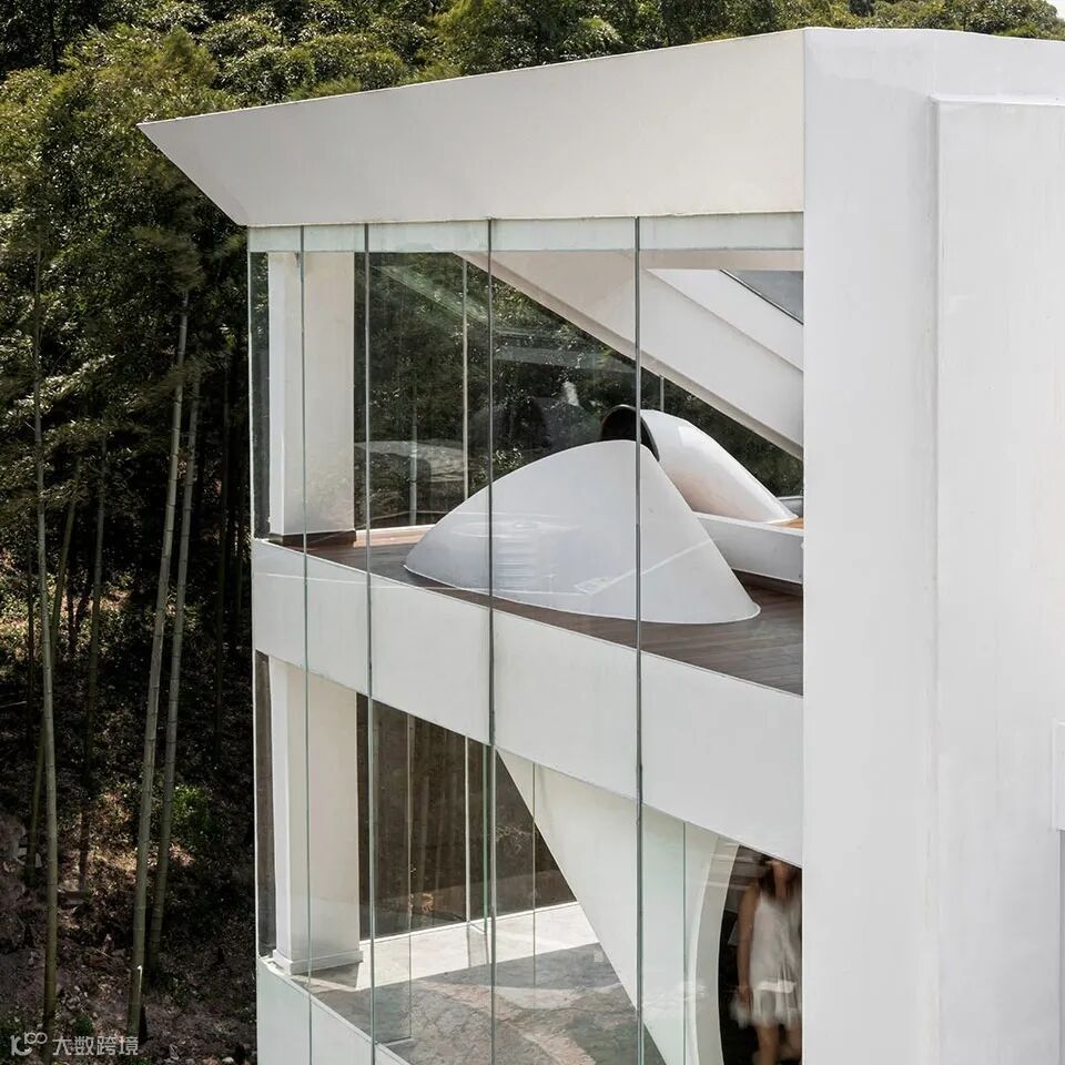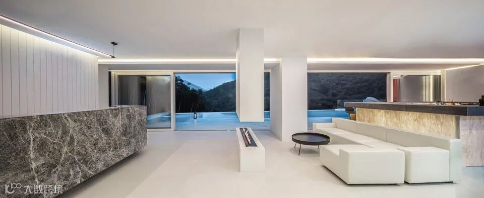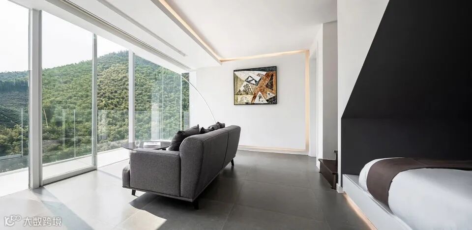 建筑通体白色,崇山峻岭中的显得十分纯粹与独立,超大落地窗将自然景观与空间融合。