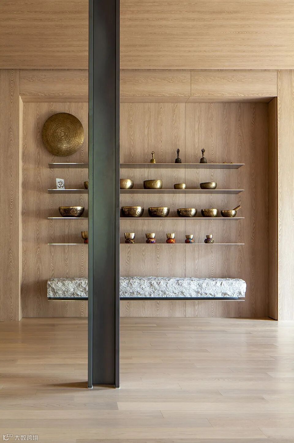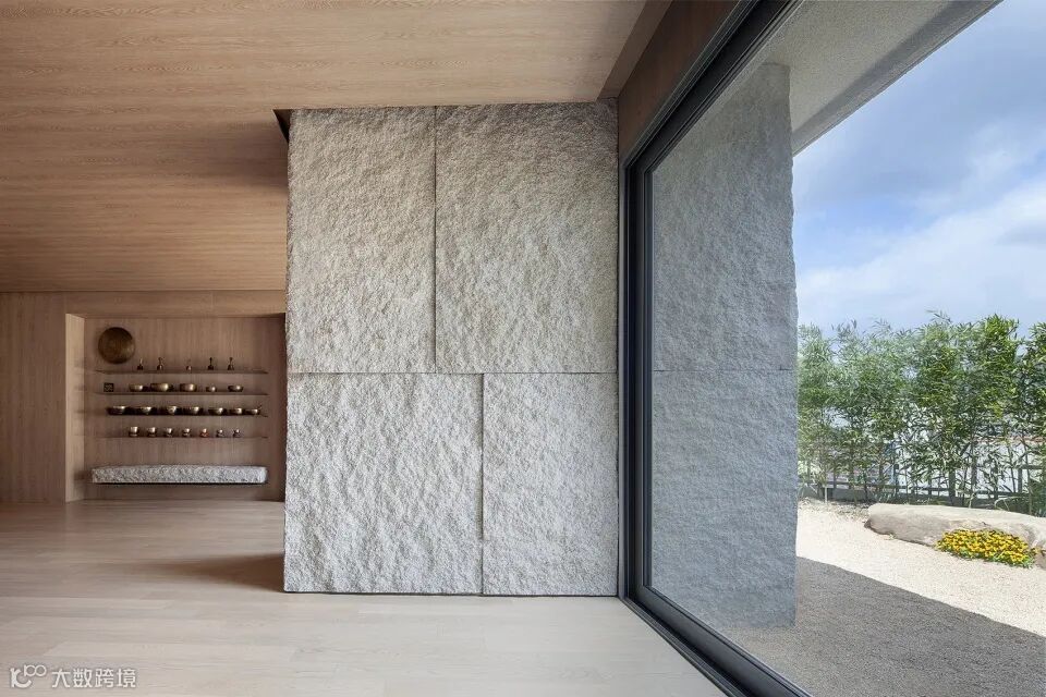 入口处与建筑外立面材质形同,走廊幽长深邃,与瑜伽净化心灵的主旨相结合,用同质化的设计手法打破室内外环境之间的界限。