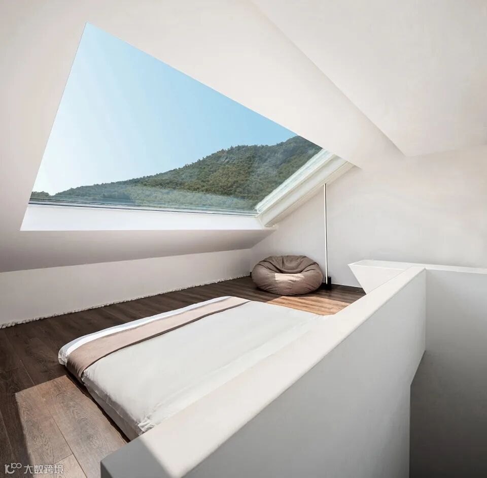 二楼为loft形式,美景尽收眼底。天窗用于观景的同时,也解决了阁楼斜坡天花板逼仄感。