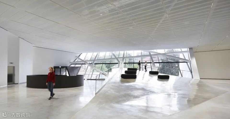 5米高悬臂式玻璃墙,带来极开阔视野,凸显建筑科技感。在建筑北侧,8米通高玻璃入口,一方面将阳光引入底层空间,另一方面也使参观者能够对上层景色一览无余。