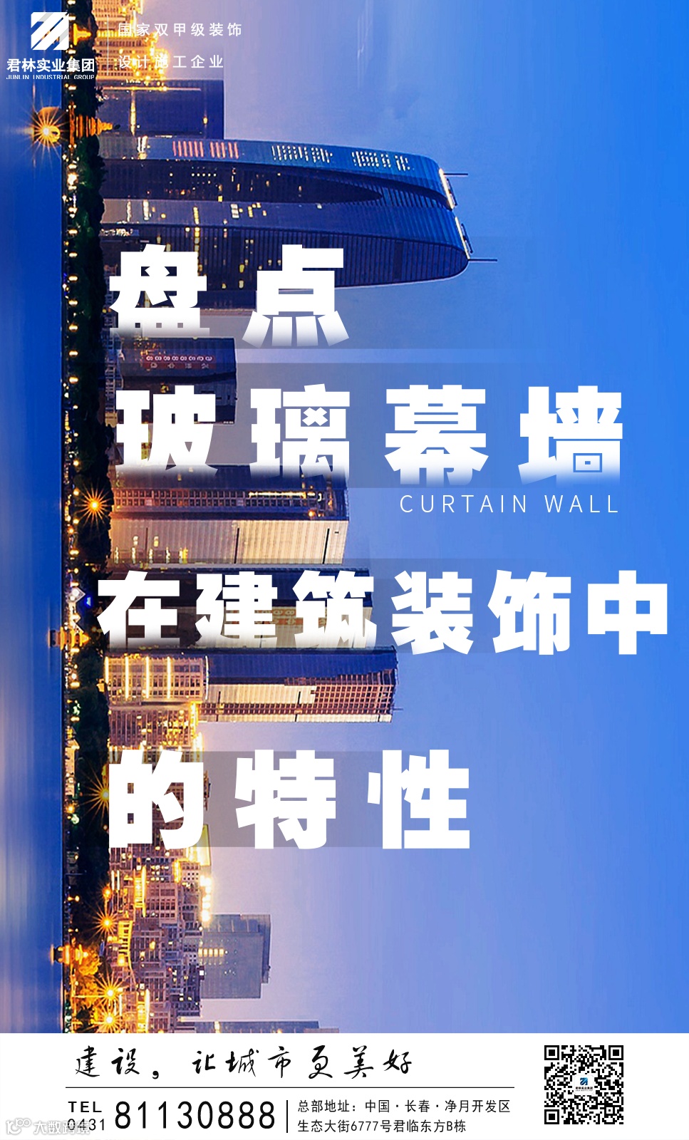 吉林省君林实业集团有限公司,是国家建设部批准的建筑装修装饰、幕墙施工工程专业承包双一级资质施工企业。专注于幕墙、建筑装饰工程领域,标准化施工工艺,聚焦艺术美观,打造数十项国家级、省级重点工程,是吉林省幕墙装饰行业的标杆企业。