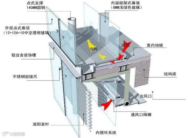 敞开式外循环体系呼吸式幕墙外层是单层玻璃与非断热型材组成的玻璃幕墙,内层幕墙是隔热或断热明框幕墙或者隔热或断热单元幕墙。内外两层幕墙形成的通风间层的两端装有进风和排风装置。可根据需要在热通道内设置可调控的铝合金百叶窗帘或者电动卷帘, 有效地调节阳光的照射。