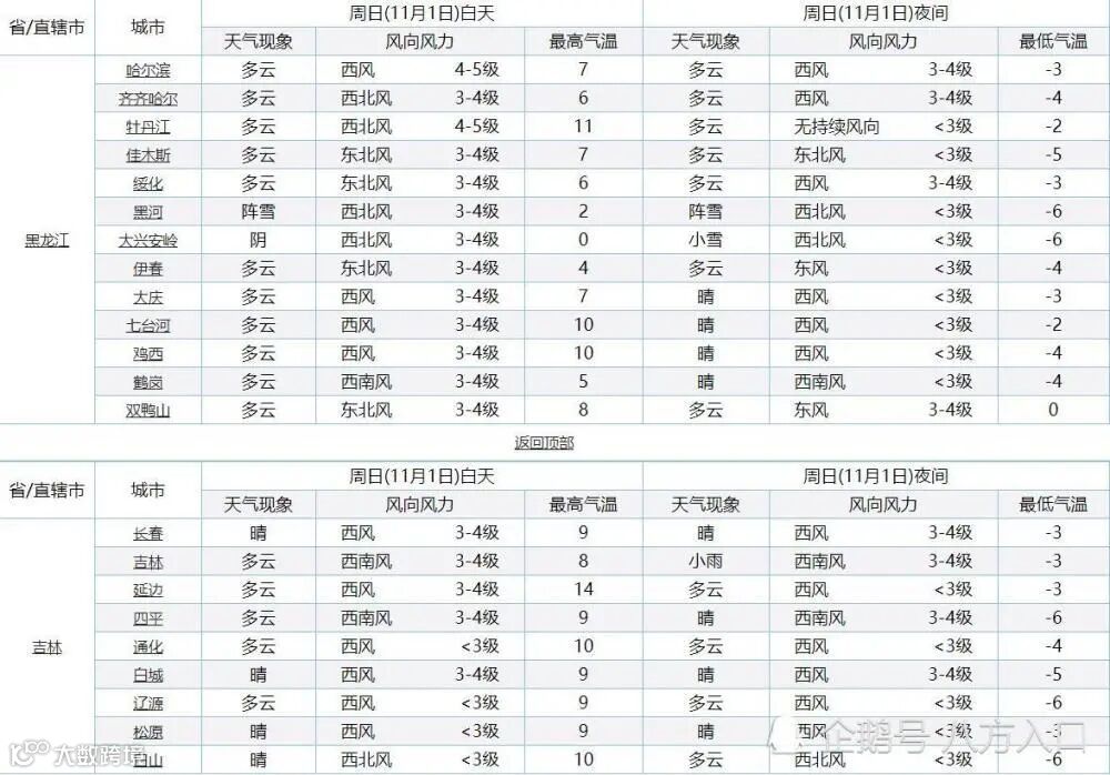 黑龙江的大兴安岭最高气温降至0℃,其余各地的最高气温普遍是在2~11℃,最低气温普遍是在0~-6℃。