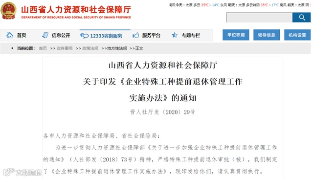 二、日前,山西省人力资源和社会保障厅印发了《企业特殊工种提前退休管理工作实施办法》的通知
