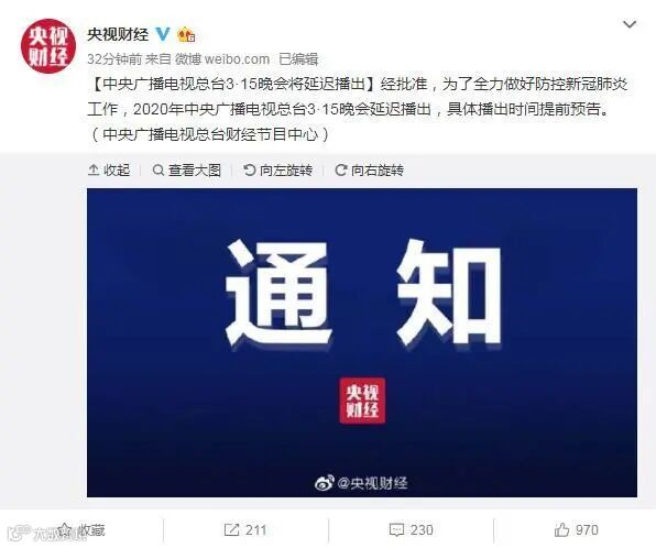 据央视财经报道,中央广播电视总台财经节目中心宣布,为了全力做好防控新冠状肺炎工作,2020年中央广播电视总台3·15晚会延迟播出,具体播出时间提前预告。