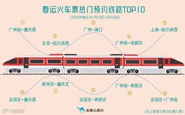 从某旅行APP火车票预约情况来看,广州南-重庆西、北京-哈尔滨西和广州-海口,成为2020年春运期间旅客热度最高的三条线路。