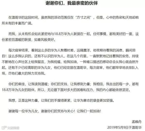 2019年5月9日孟晚舟给所有