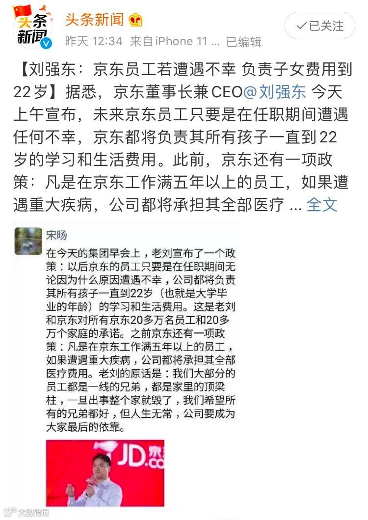 25日上午,刘强东宣布:未来京东员工只要是在任职期间遭遇任何不幸,京东都将负责其所有孩子,一直到22岁的学习和生活费用!