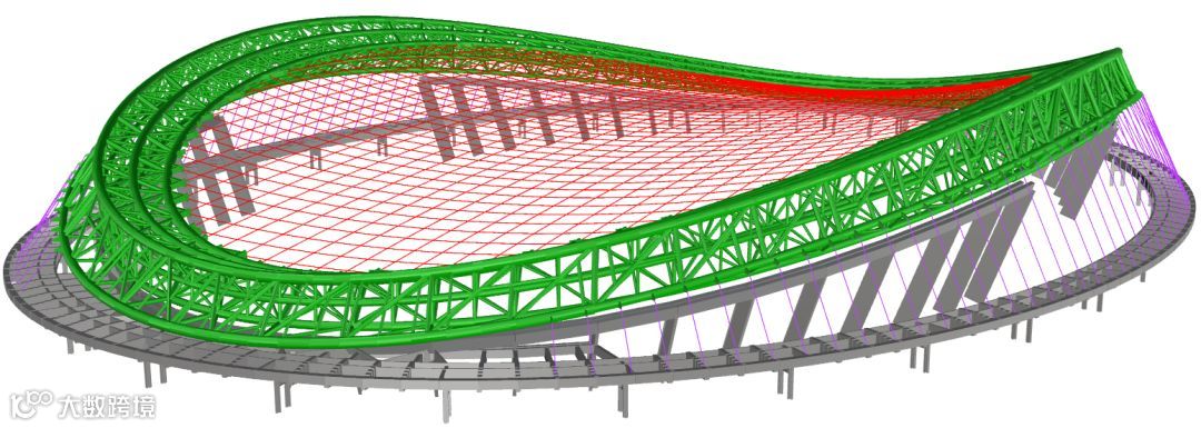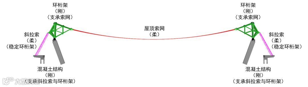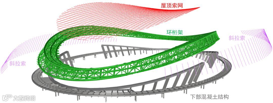 “骨架”内部,环桁架为索网提供闭合的椭圆形边界,支承于48根看台柱与环梁组成的混凝土结构上;斜拉索上端拉接于环桁架外侧,下端与混凝土结构相连,主要起平衡索网内力、提高环桁架稳定性和为幕墙结构提供支承的作用。索网、环桁架和斜拉索三者共同组成了一套刚柔相间、刚柔相济的协同受力体系。