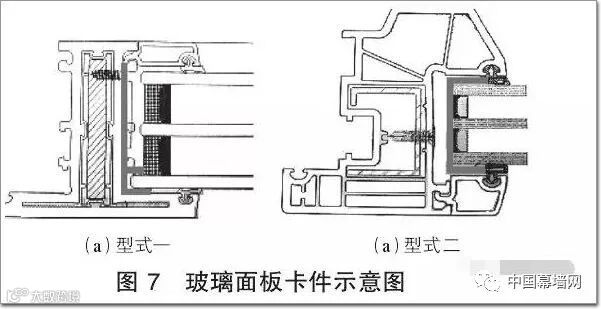 在耐火窗产品设计中,玻璃面板卡件是必不可少的一个辅助配件。由于型材在高温条件下,其受火面会发生变形、熔化等现象,从而失去部分或全部的支撑作用。在这种情况下,即使防火玻璃自身可以满足耐火性能的要求,也会因为失去型材的支撑而整体坍塌脱落。为了防止这种情况发生,必须在耐火节能门窗的玻璃面板和框架型材之间,配置卡件。目前,根据所夹持玻璃面板的类型不同,实践中有多种型式的卡件,如图7 所示。